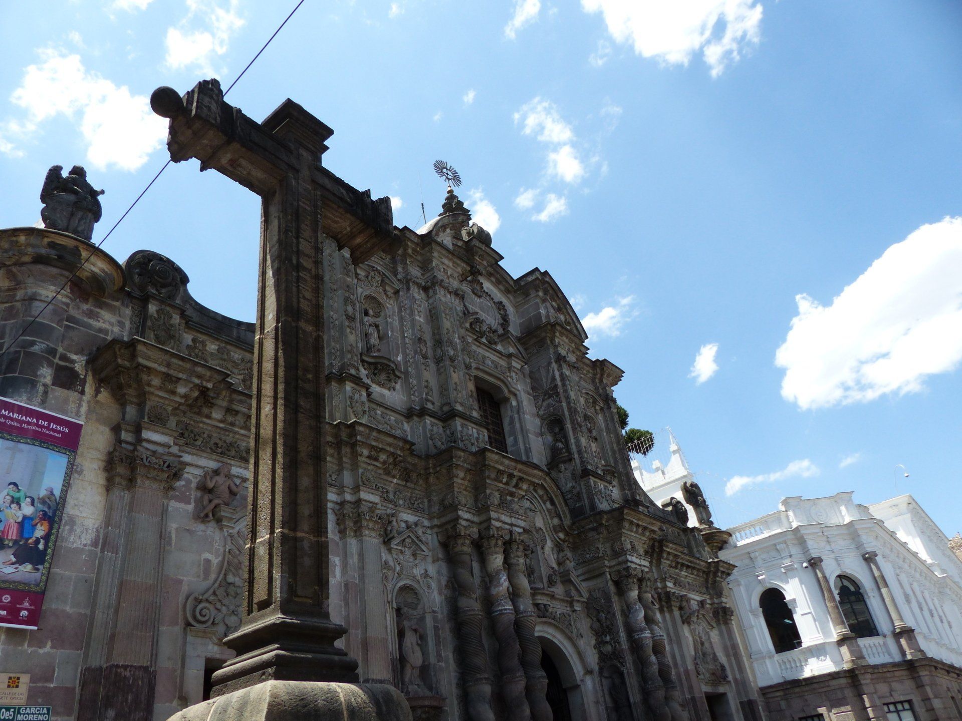 So besichtigen wir zuerst die Iglesia de la Compañía de Jesús. Tatsächlich wird hier sogar Eintritt genommen (USD 5). Innen erschlägt uns fast die Pracht und das Gold. Die Kirche des Jesuitenordens wurde in der ersten Hälfte des 17. Jahrhunderts erbaut. Als Vorbild diente für diesen Nachbau San Ignacio in Rom. Die Iglesia de la Compañía de Jesús gilt als die prächtigste Kirche Quitos, manchen meinen sogar, es sei die prächtigste in ganz Südamerika. Wir können uns hier nur anschließen. Wir haben schon die eine oder andere Kirche in Südamerika besucht, aber diese hier ist die prächtigste, die wir bisher gesehen haben. Im Inneren wurden Unmengen Blattgold verwendet und über 100 Gemälde und Skulpturen kann man entdecken. Wenn man genau hinschaut, stellt man fest, dass sich nicht nur spanische Elemente in der Kirche befinden, sondern auch eine Darstellung der Sonne eines indigenen Stammes.