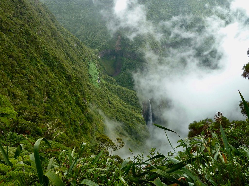Irgendwann haben wir es dann tatsächlich geschafft und stehen oberhalb des Aussichtspunktes. Vor uns liegt das Höllenloch, Trou de Fer. Zumindest theoretisch, denn wir sehen, nichts, rein gar nichts außer Nebel und davon nicht gerade wenig. Wir beschließen, nicht gleich wieder umzukehren, sondern ein wenig zu warten, denn das Wetter kann hier auch in Minutenschnelle umschlagen. Nach etwa 15 bis 20 Minuten des Wartens lichtet sich tatsächlich der Nebel nach und nach. Wir werden belohnt und können in das Höllenloch hineinschauen. Wasserfälle, die teilweise eine Höhe von 300 Metern erreichen, fallen in die Tiefe, es ist spektakulär und auch nur für wenige Minuten sichtbar. Dann legt sich bereits der Schleier des Nebels wieder über die Szenerie. Was hatten wir dennoch für ein Glück, diesen Blick erhaschen zu können.