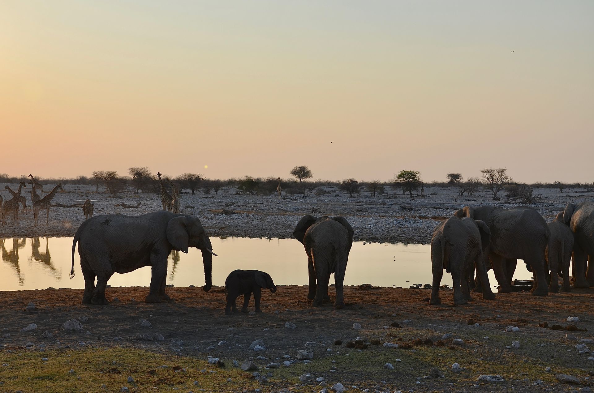 Am Wasserloch, das unterhalb des Dolomite Camps liegt, empfängt uns eine Elefantenherde und ein weiteres Nashorn. Insgesamt habe ich 12 Nashörner im Etosha Nationalpark gesehen und mein Mann sogar eines mehr. Damit hatten wir niemals gerechnet und sind sehr glücklich darüber.