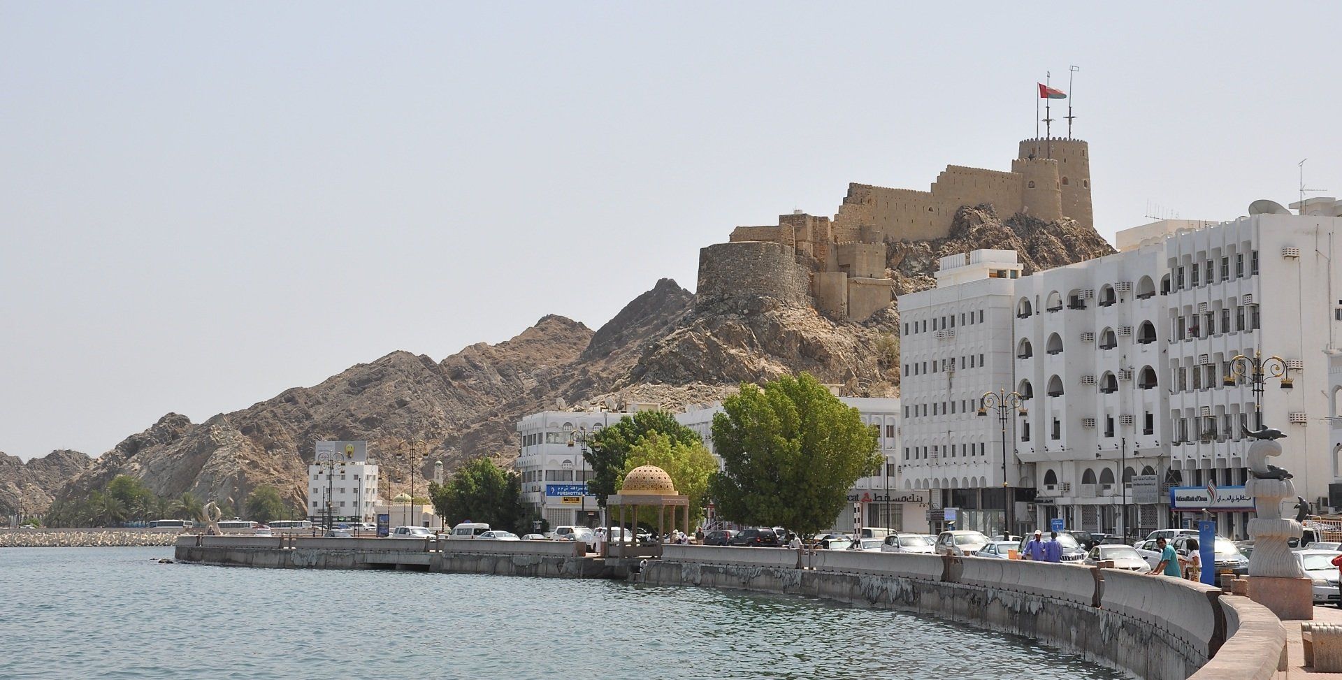 Nach 6 Stunden und 15 Minuten Flug landen wir am nächsten Morgen mit 2 Stunden Zeitverschiebung in der Hauptstadt des Sultanats Oman, in Muscat.