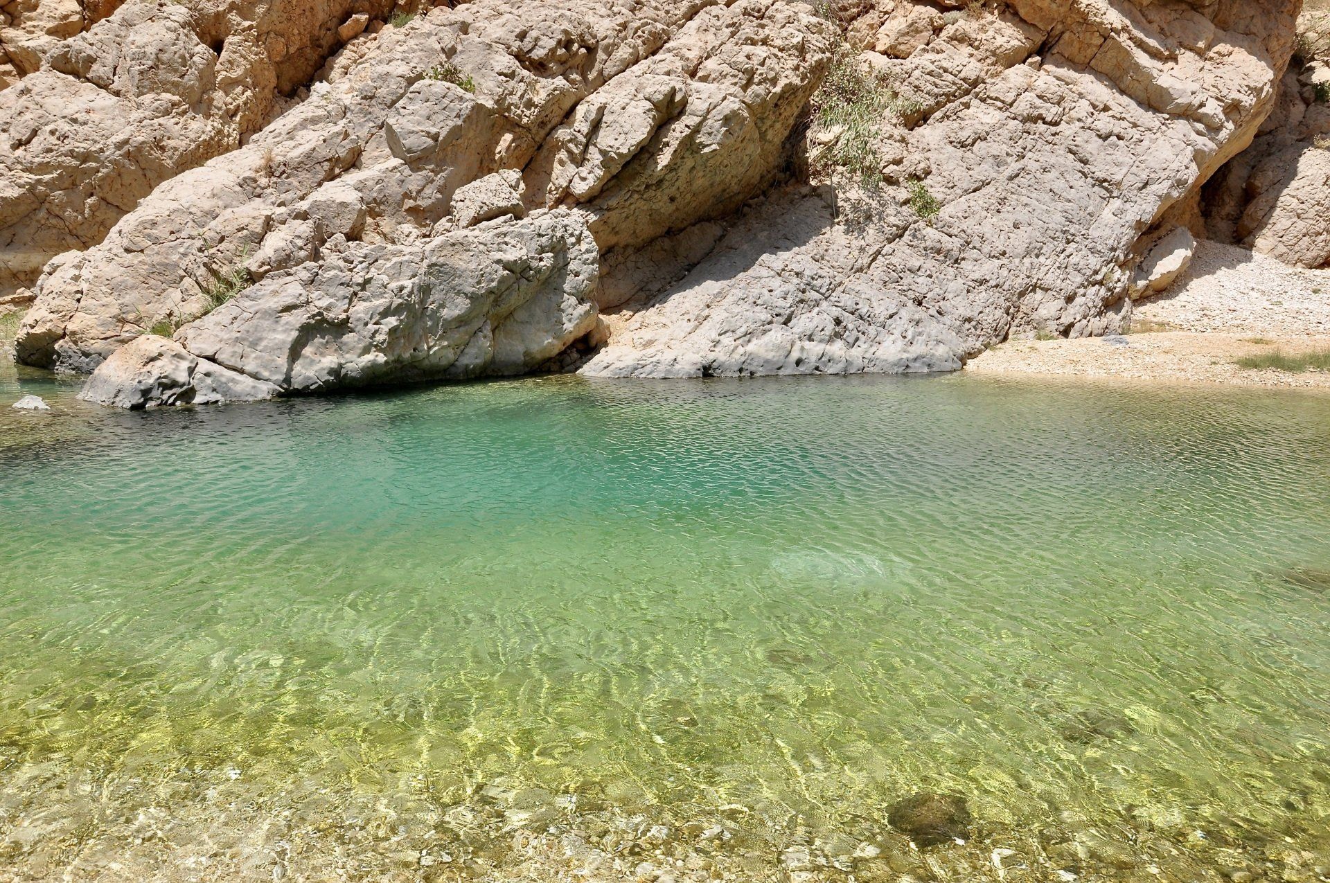 Der Wadi verengt sich am Ende der Strecke durch das Kiesbett immer mehr. Der Kies verschwindet langsam und weicht Felsen, an denen und unter denen wir entlang laufen. Unsere Blicke fallen auf Pools, die in den verschiedensten Blau- und Grüntönen wunderschön schimmern. Leider wird dieser Eindruck mehr als einmal durch (Plastik-)Müll getrübt.