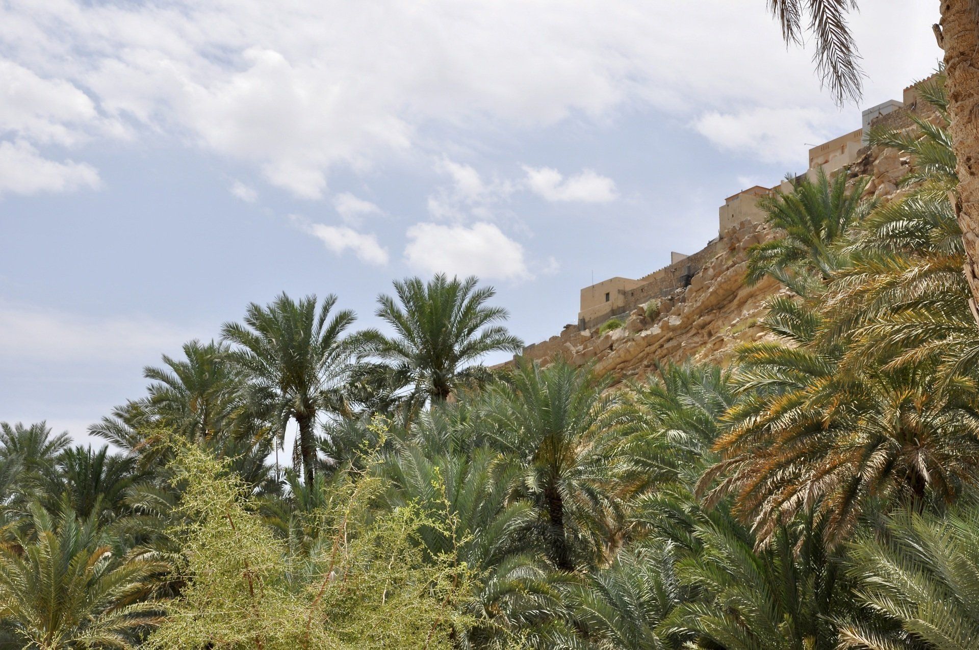Gleich zu Beginn befindet sich die große farbige, wunderschöne Lagune Muqal, in der sich die Dattel-Palmen spiegeln. Um diese Lagune herum kann man die mit großem Geschick angelegten Bewässerungskanäle, das Aflaj-System, entdecken. Es ist wirklich bemerkenswert, wie mit einfachen Mitteln so etwas Großartiges geschaffen wurde.