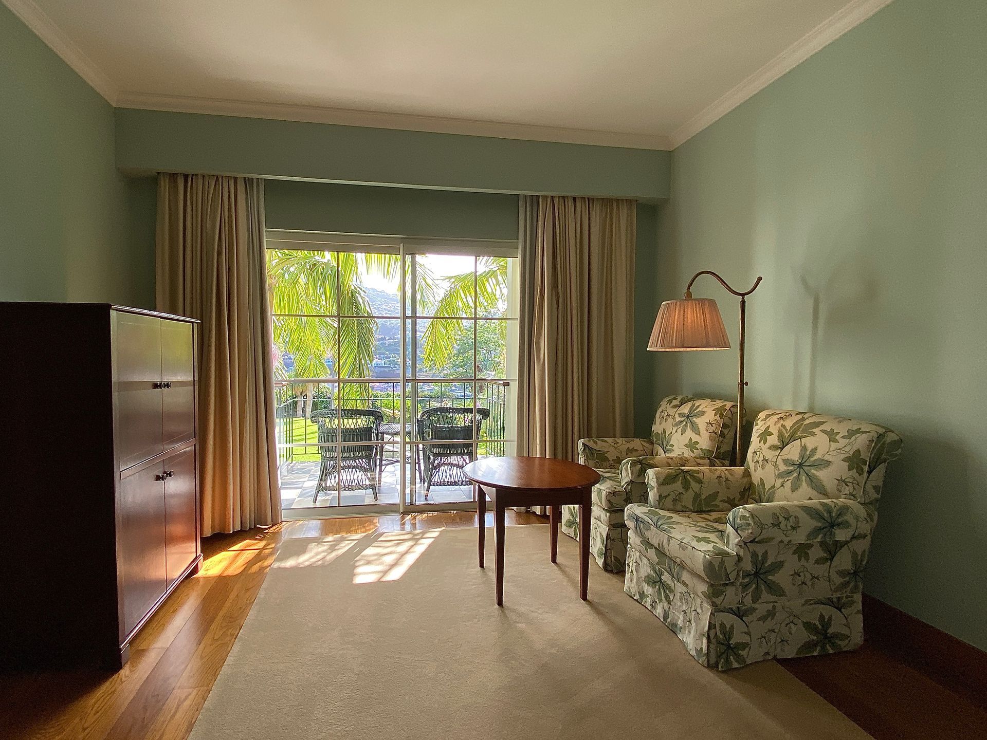 Bei Ankunft erhalten wir ein Upgrade, allerdings in genau die Kategorie, die ich mit Absicht nicht gebucht hatte, da mir das Zimmer auf den Fotos zu plüschig erschien. Es handelt sich um eines von nur 4 oder 5 Zimmern dieser Art im alten Teil des Hotels. Tatsächlich gefällt uns das Zimmer nicht. Die Atmosphäre sagt uns nicht zu und als wir dann bei Beitreten des Balkons feststellen, dass wir direkt über einer lauten Klimaanlage oder einem Abzug sitzen, reklamiere ich das Zimmer. Wir bieten an, gerne auf die von uns gebuchte Kategorie zurückzugehen, aber man gibt uns tatsächlich eine der beiden Suiten. Nun haben wir sogar einen zweiten großen Raum. Das ist ein großes Entgegenkommen des sehr freundlichen Hotelpersonals, wie wir finden.