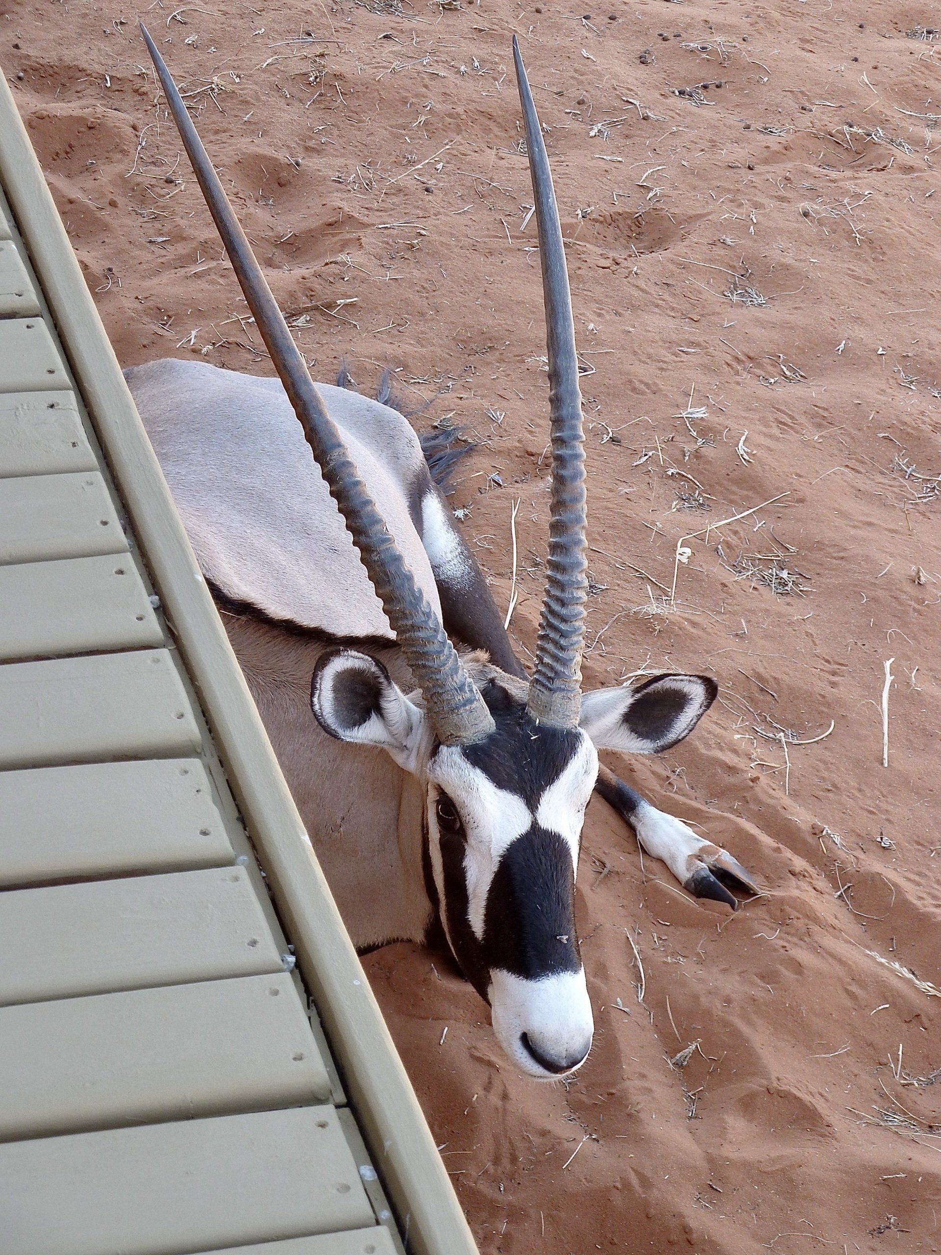 Unser Chalet steht dem Gemeinschaftsbereich in keiner Weise nach, wir haben sogar unser eigenes, privates Wildlife. Im Schatten der Terrasse unseres Chalets hat es sich eine Oryx-Antilope gemütlich gemacht. Langsam pirsche ich mich ran, um ein Foto zu machen. Aber dann wird es der Oryx doch wohl etwas unheimlich, sicherlich fragt sie sich, was ich von ihr will. Sie springt auf und läuft weg.