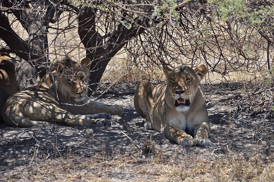 Unter zwei Büschen dösen 6 Löwen. Ich kann es Ihnen nicht verdenken, es ist brütend heiß. Nur wenige Meter entfernt von diesem faulen Grüppchen können wir uns hinstellen, warten und sie ausgiebig beobachten. Auch hier stehen wir wieder ganz alleine, welch ein Privileg.