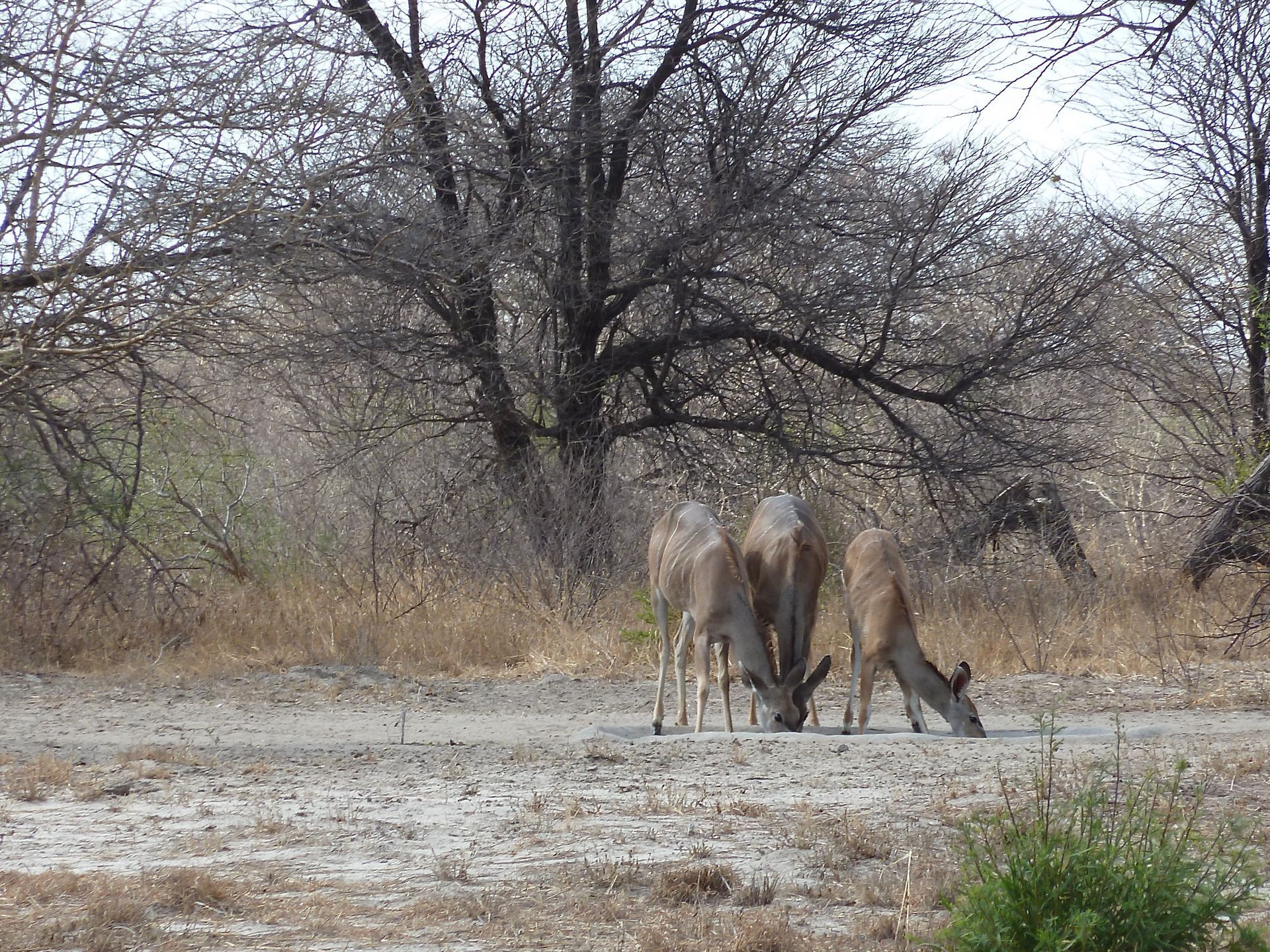 Den Morgen verbringen wir zumeist auf der Terrasse des Gemeinschaftsbungalows; immer wieder mit unglaublich netten und interessanten Gesprächen mit den beiden Dombos. Am Wasserloch finden sich Antilopen und Steinböckchen ein, die am Morgen bereits um unseren Bungalow grasten, stillen ebenfalls ihren Durst.