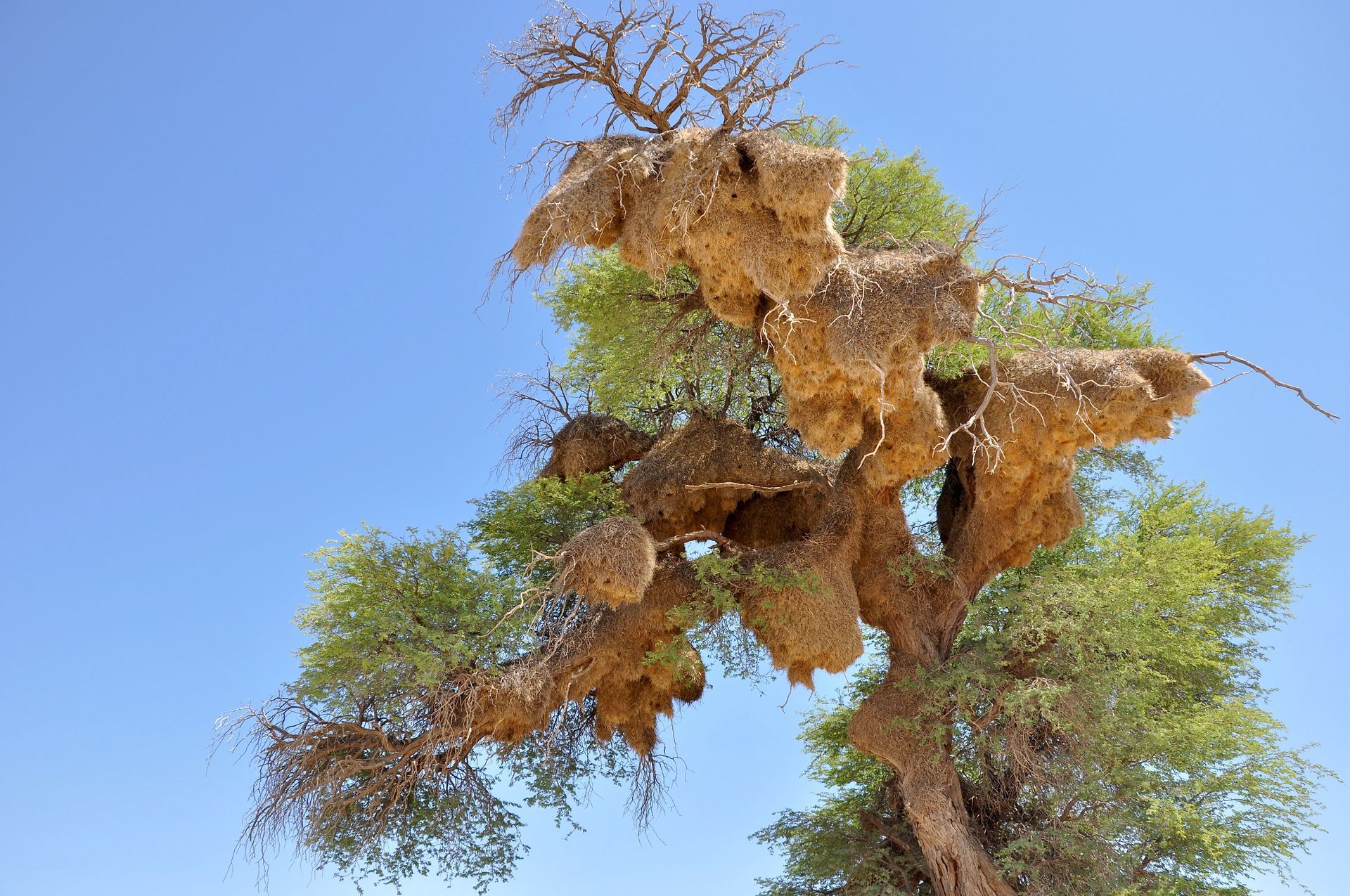 Nichtsdestotrotz ist das für uns eine wunderbare und ergiebige Pirschfahrt, Kalahari-Löwenmännchen, Hyänen und Gepard, das Ganze garniert mit Webervogelnestern vor stahlblauem Himmel, in grünem Geäst und auf rotem Kalaharisand. Was will man mehr? Nun gut, ich muss zugeben, vielleicht eine Kamera mit funktionierendem Telezoom. Genug gejammert. Wir müssen das Beste daraus machen und unsere Reise weiterhin genießen.