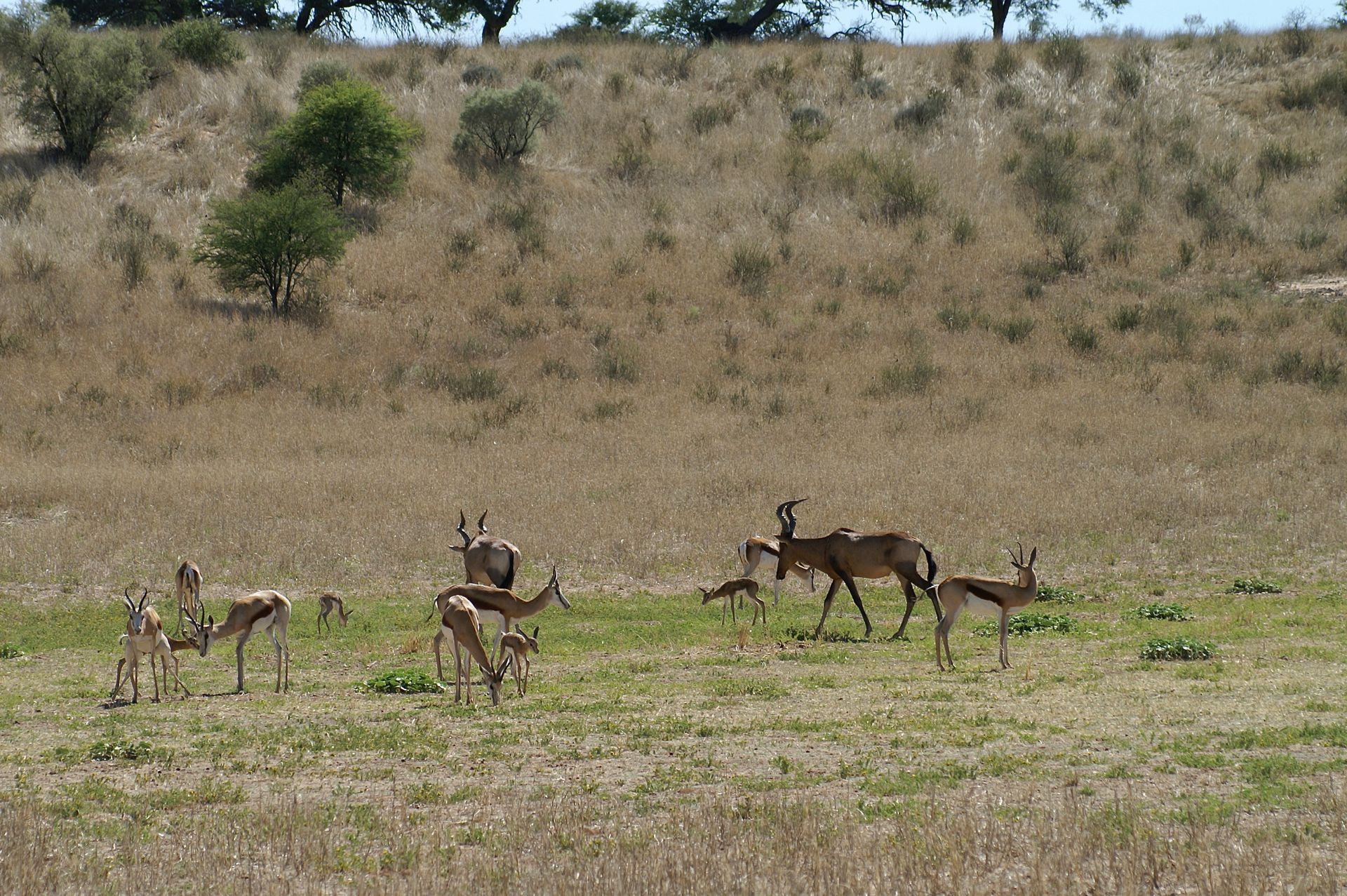 Nun ist es nicht mehr weit bis zu unserem Tagesziel, dem Kalahari Tented Camp, wo ich das größte Zelt, das Honeymoon Chalet ganz am Ende einer Reihe von Zeltcamps, gebucht habe. Zur Begrüßung ziehen am Abend einige Gnus und Antilopen durchs ausgetrocknete Flussbett. Hier gefällt es uns richtig gut, hier könnten wir es länger aushalten.
