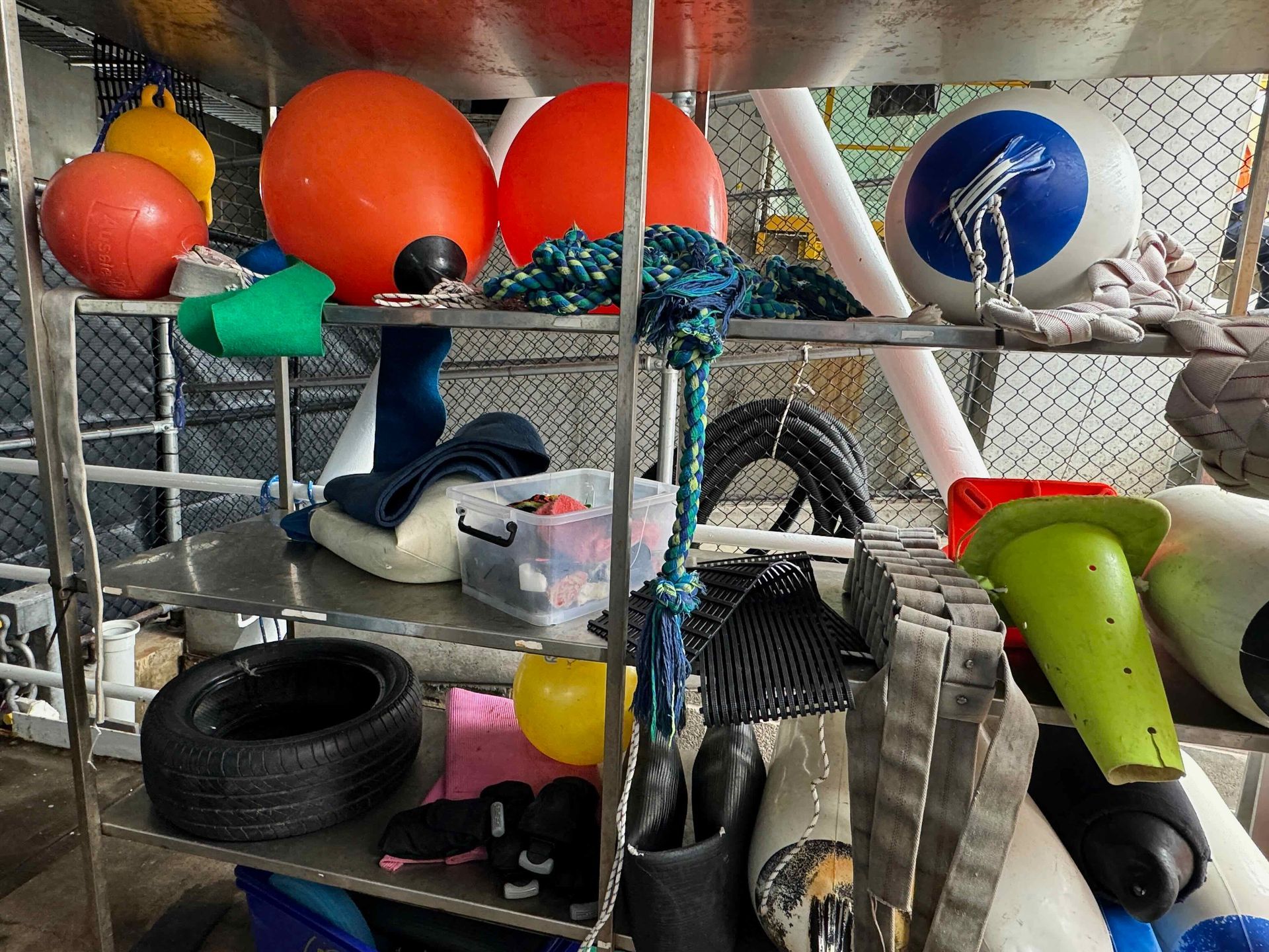 Während unserer fast privaten „Behind the Scenes Tour“, an der neben uns nur noch eine Frau mit ihren beiden Söhnen teilnimmt, erfahren wir sehr viel über Pig. Weltweit gibt es nur drei Dugongs, die in menschlicher Obhut leben. Eine(r) in Japan, einer seit einem Jahr in Abu Dhabi und dann Pig hier in Sydney. Allen drei gemeinsam ist, dass sie gerettet wurden. So wurde Pig vor 25 Jahren vor Queensland gefunden. Er war erst wenige Wochen alt. Weit und breit war kein weiblicher Dugong auffindbar. So wurde er von Menschen aufgezogen. Später hat man ihn in die Freiheit entlassen, aber er magerte extrem ab und hätte diese Freiheit nicht überlebt. Nun lebt er im Aquarium in Sydney und ist – wie es Normalität ist bei einem Dugong - „high maintenance“. Jede Viertelstunde erhält er eine Ration Salat, fein säuberlich auf einer Art Tablet serviert. Er frisst 45 kg Salat am Tag. Allerdings nicht einfach nur Salat, sondern den qualitativ hochwertigsten. Der Salat muss knackig sein, sonst verweigert Pig die Nahrungsaufnahme. Auch die Ausstattung seines Spielzeugregals kann sich sehen lassen.